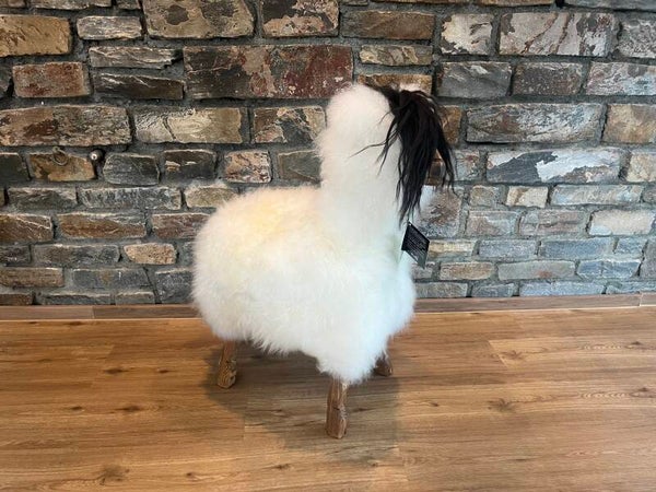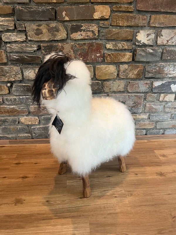 Handgschnitztes Unikat aus Vollholz u. echtem Schaffell, Höhe 80cm, Breite 37 - 40cm, Länge ca. 55cm.